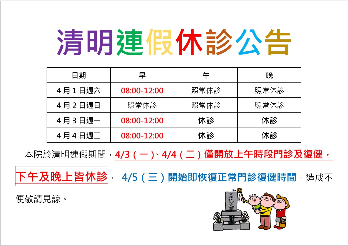 清明連假休診公告 日期 早 午 晚 4月1日週六 08:00-12:00 照常休診 照常休診 4月2日週日 照常休診 照常休診 照常休診 4月3日週一 08:00-12:00 休診 休診 4月4日週二 08:00-12:00 休診 休診 本院於清明連假期間,4/3(一)、4/4(二)僅開放上午時段門診及復健,下午及晚上皆休診, 4/5(三)開始即恢復正常門診復健時間,造成不便敬請見諒。